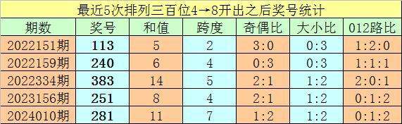 1、排列三最近两期百位号码分别开出4和8,历史上百位号码连续两期分别开出4和8的奖号出现了62期。前五期开出之后其下期奖号分别为:113、240、383、251、281;