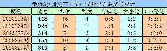 1、最近两期排列三十位号码开出号码分别为1和9,历史上十位号码连续两期同时出现号码1和9的奖号共开出69期。最近五次下期开出号码为:448、925、314、154、314;