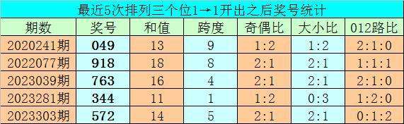 1、排列三前两期个位分别开出号码1和1,历史上个位号码连续两期分别出现1和1时,共有61次。在最近5次出现时,其下期分别出现号码:049、918、763、344、572;
