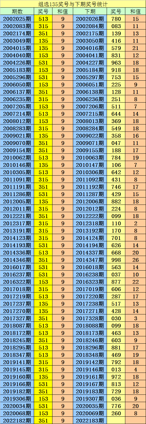第2022182期3D奖号组选为:135,历史上该号码组选出现56次,下期号码分别为:780、083、139、416、579、831、963、918、753、225、128、251、511、644、369、549、358、047、188、784、106、642、431、746、429、882、224、099、110、170、701、626、668、998、563、037、877、606、287、517、428、030、099、463、603、881、469、792、013、972、813、729、036、776、260。