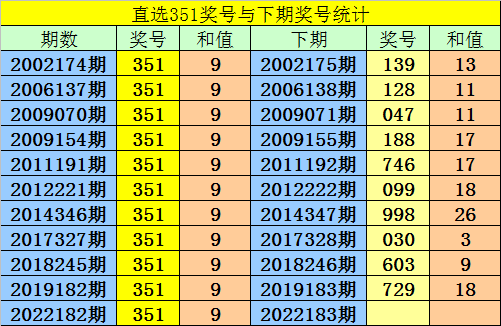 第2022182期3D奖号为:351,历史上该号码直选开出11次,下期号码分别为:139、128、047、188、746、099、998、030、603、729。