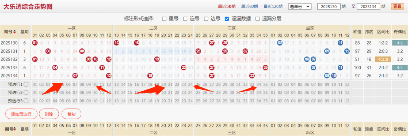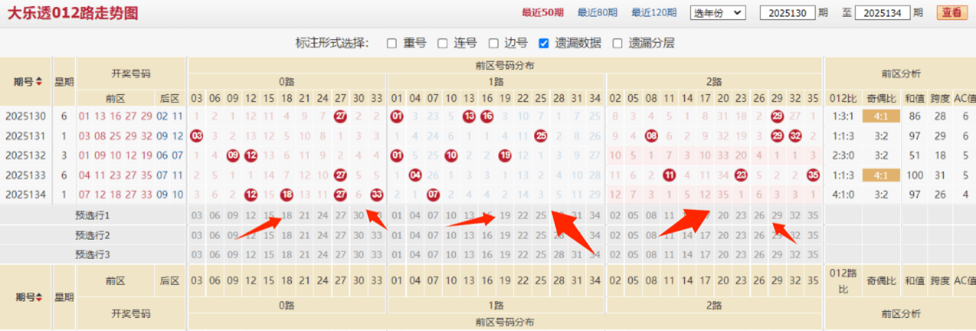 上期大乐透的开奖号码为:07 12 18 27 33+09 10,和值为97,跨度为26,区间比例为2:1:2,奇偶比例为3:2,012路比例为4:1:0,上期大乐透号码的整体组合位置没什么太大问题,相对来说间隔为5的组合还是出现,不过上期大乐透在路数上的考虑处理还是比较极端,0路号码的热度达到极致,本期需要重点区调整的策略点主要在于路数的调整以及重连考虑,这是本期号码的初始基本思路。
