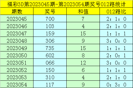 上期回顾:福彩3D第2023054期开出奖号:117。奖号为组三形态,与试机号没有同,奇偶比为3:0,大小比为1:2,012路比为0:3:0,和值为9,跨度为6。