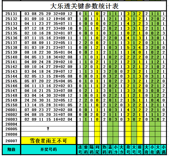 以下是作者手工统计的大乐透关键参数统计表,对喜欢参数分析、过滤缩水、选号胆杀的技术性大乐透爱好者有所帮助,其它读者可略过不看。