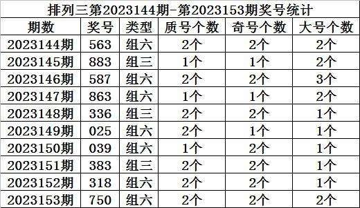 上期回顾:排列三第2023153期开奖:750,质合比为2:1,奇偶比为2:1,大小比为2:1。