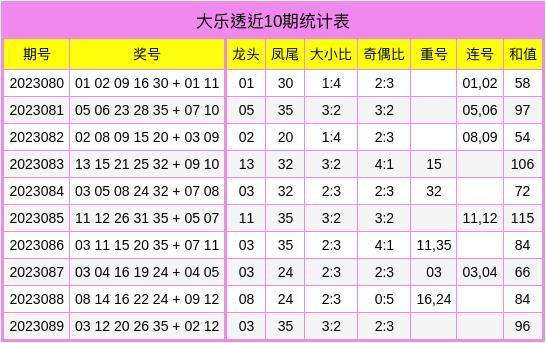 大乐透第2023089期奖号为:03、12、20、26、35,后区02、12。前区号码大小比为3:2,三区比为2:1:2,奇偶比2:3。前区和值为96。
