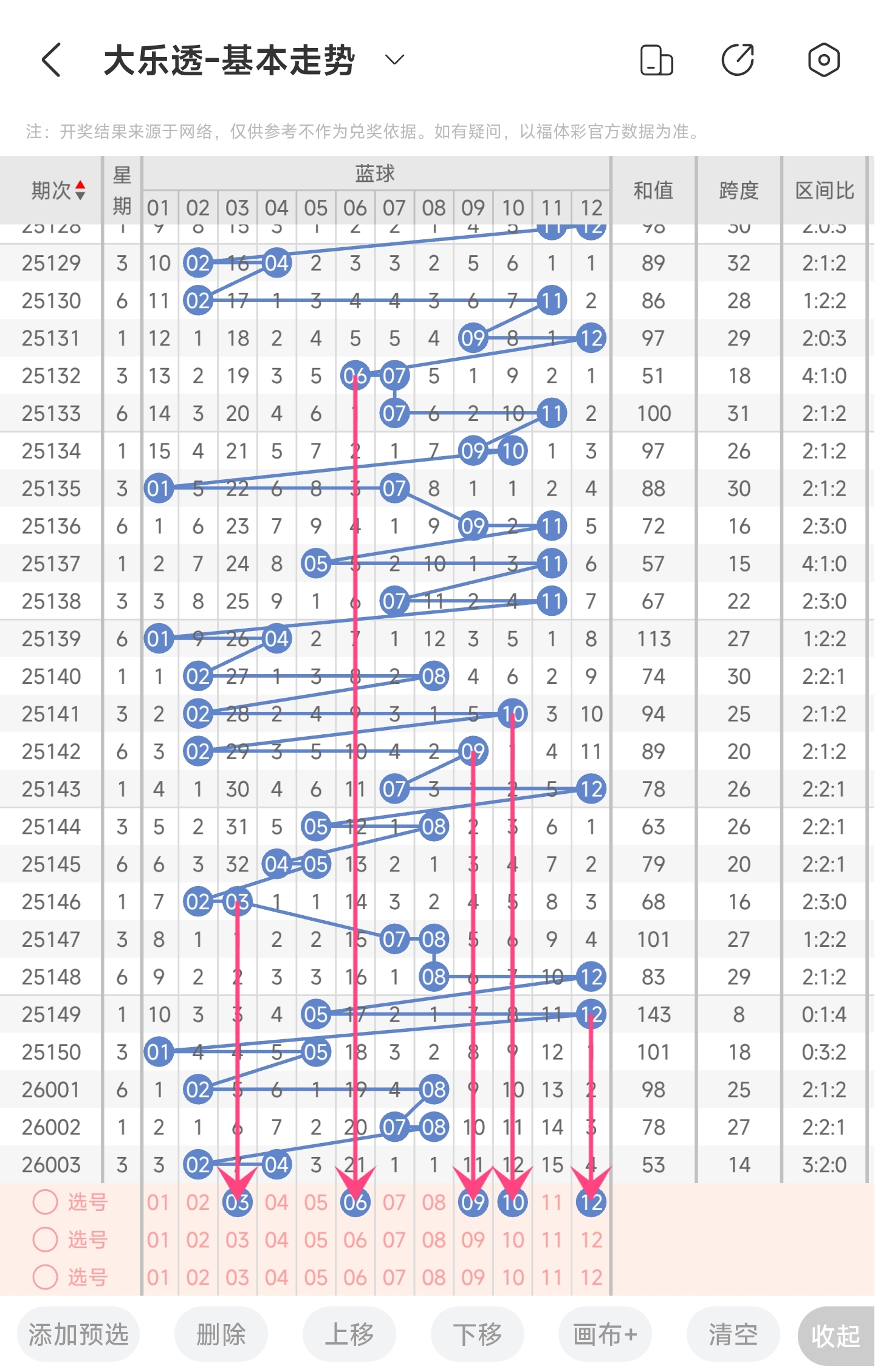 上期开出了2,4号球。往前一期开出了7,8号球。通过分析蓝区走势图,我们可以看到蓝球近2期跨度都是很小的。推测本期会变大,本期可以关注彼此跨度比较大的号码。最后再结合冷热号情况以及遗漏期数,本期我们可以关注3,6,9,10,12等号。综上所述本期我们推测可能开出3,6,9,10,12等号码。