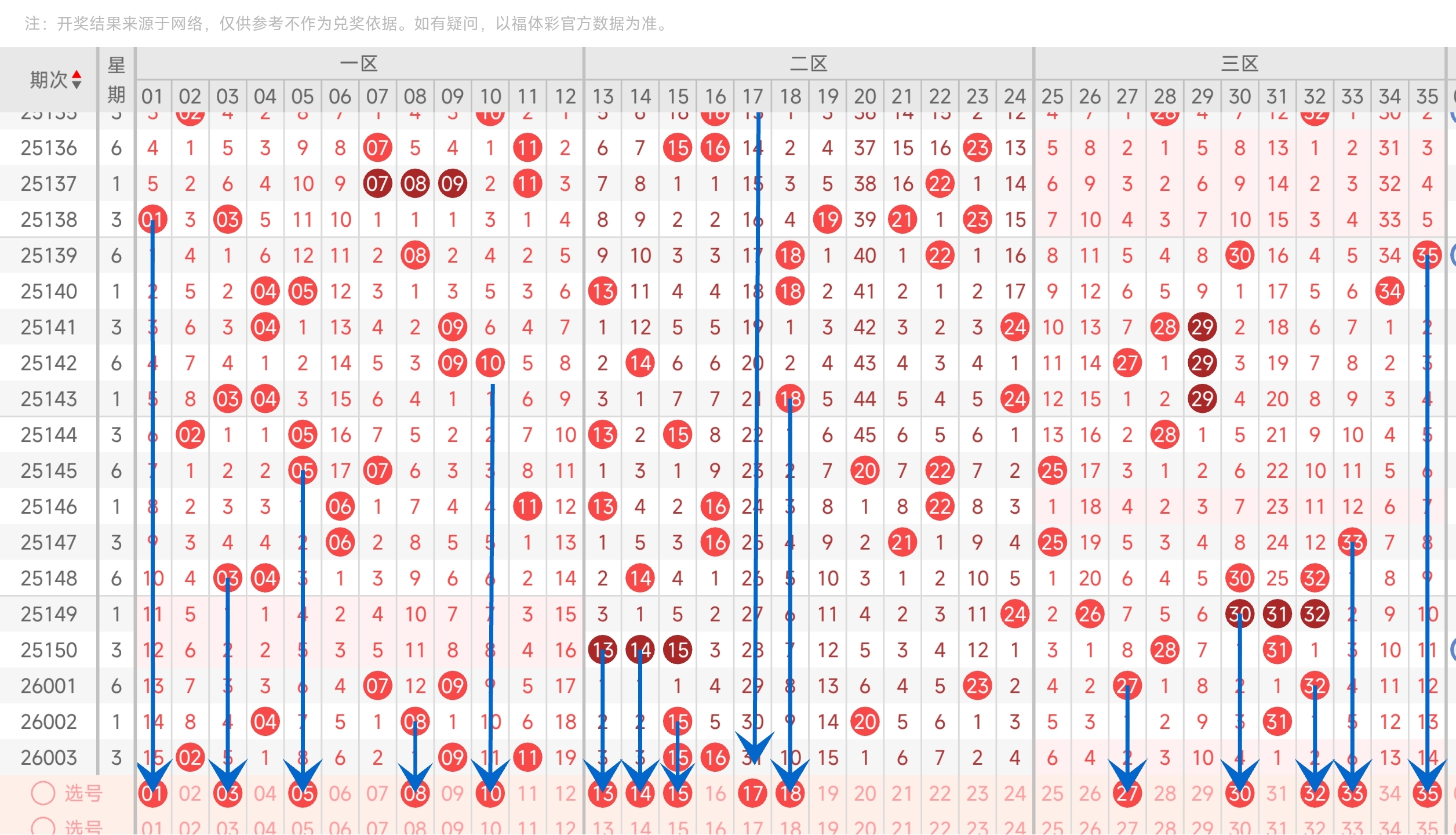 上期没有开出号码,往前一期开出了31号球。通过分析走势图,可以看到上期没有开出号码,近期是中间偏右的号码最为热门,本期继续关注,其次是防左边的号码回补。最后再结合冷热号和遗漏期数,本期我们可以关注27,30,32,33,35等号。综上所述本期三区我们推测可能会开27,30,32,33,35等号码。