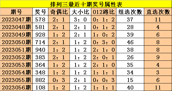 上期回顾:体彩排列三第2023056期奖号:108。,奇偶比1:2,大小比1:2,012比1:1:1。