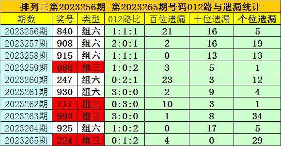 开奖回顾:排列三第2023265期奖号为:224,类型为组三,号码012路比为0:1:2,百十个位号码直选分别遗漏4期、0期和29期。