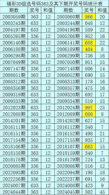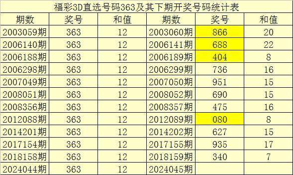 一、开奖回顾:第2024044期福彩3D奖号为363。奖号奇偶比为2:1,和值为:12,跨度为:3。