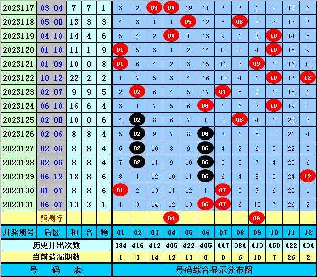 后区分析【一区01-04,二区05-08,三区09-12】:上期后区奖号为06和07,全部出现在第二区,近50期后区三区比为30:33:37,近10期三区比为6:10:4,本期注意第一、三区号码出现,关注两码04+09。