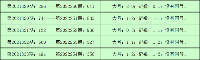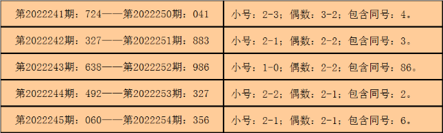 所以,3D第2022246期开出奖号:222,其大小比为0:3,奇偶比为0:3,012路比为0:0:3,与3D第2022255期奖号可能有同号。