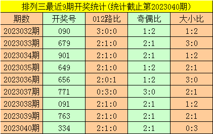 二、体彩排列三前9期奖号开出:090-679-901-649-656-771-091-763-334,其中奖号大小比为15:12,012路比为17:9:1,奇偶比为16:11;