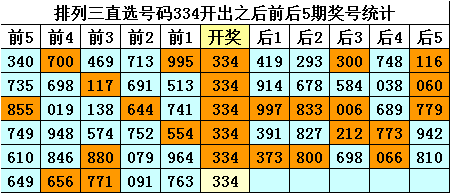 四、排列三直选号码334历史上开出6次,其前后五期奖号分别为: