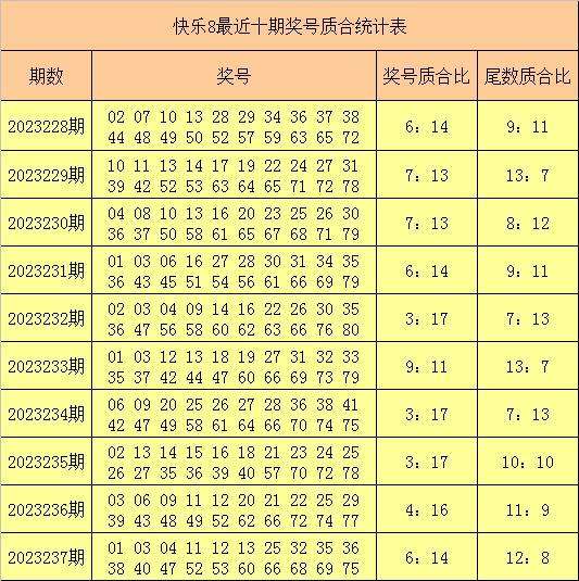 福彩快乐8第2023237期开出奖号:01 03 04 11 12 13 25 32 35 36 38 40 47 52 53 60 66 68 69 75,其中奖号质合比为6:14,奖号尾数质合比为12:8。