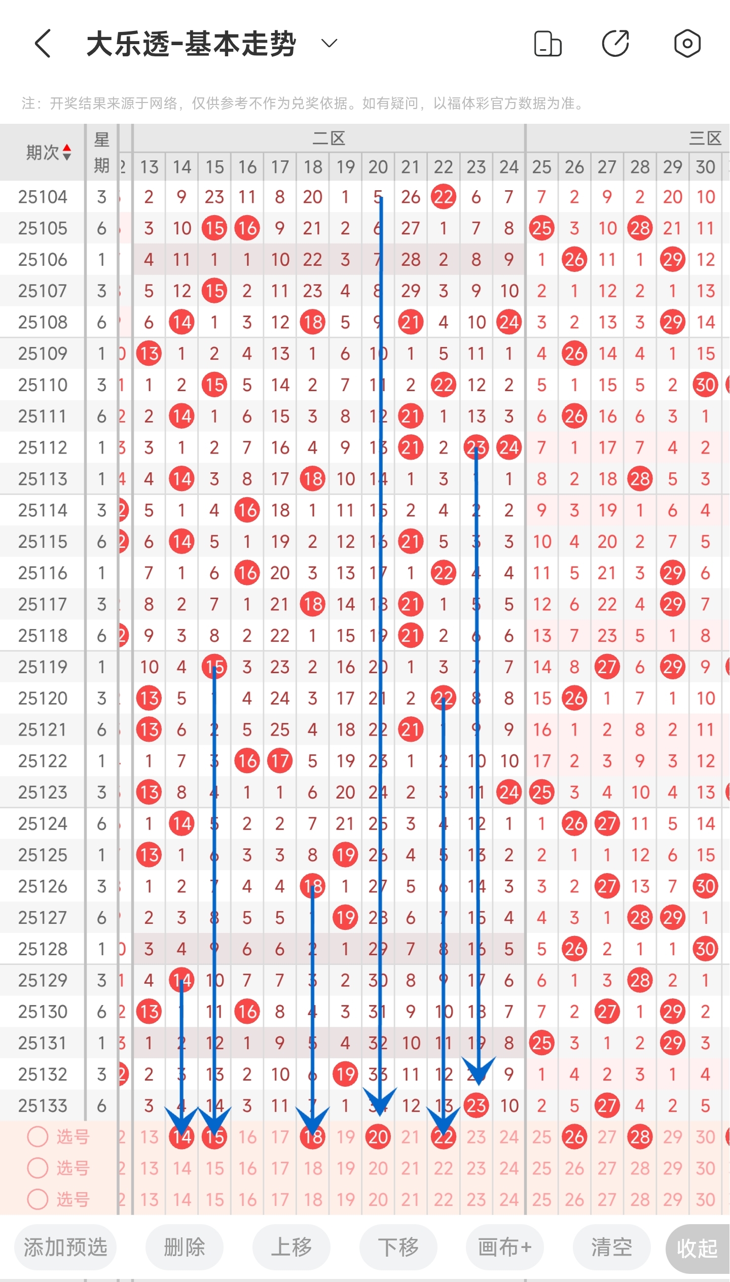 上一期开出了23号球,往前一期开出了19号球。通过分析走势图,可以看到上期号码开在了右边,右边在空缺好久后有了号码回补,本期继续关注一下回补的可能性。除此之外的号码,我们主要关注左边和中间位置的号码。最后再结合遗漏情况和冷热号,本期我们可以关注14,15,18,20,22等号。综上所述我们可以推测本期可能会开出有14,15,18,20,22等号码。