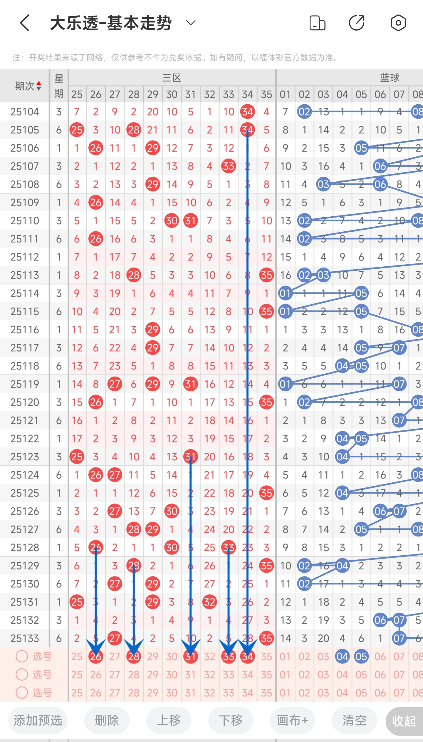 上期开出了27,35号球,往前一期没有开出号码。通过分析走势图,可以看到最近号码开在左边的比较多,其次是右边和中间。所以本期我们策略是主要关注左边的号码,其次是右边的,最后是中间的。然后再结合冷热号和遗漏期数,本期我们可以关注26,28,31,33,34等号。综上所述本期三区我们推测可能会开26,28,31,33,34等号码。