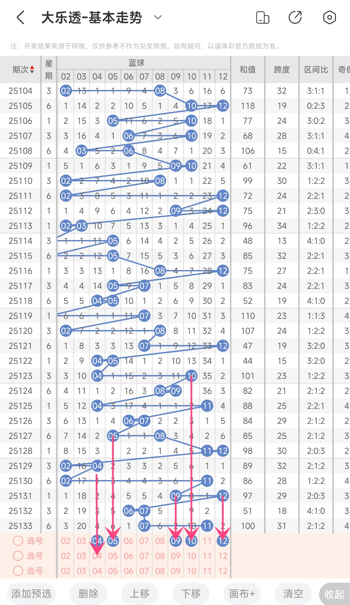 上一期开出4,11号球。往前一期开出1,9,10,12号球。通过走势图分析,可以看到上期龙头开了4号球,最近龙头走势还是很稳定的,基本开在左边的位置,所以本期龙头我们继续关注左边的号码。除此之外其它号码,最近右边开的比较多,所以右边的号码也要关注一下。最后再结合遗漏期数和冷热号,本期我们可以关注一下2,3,5,9,10等号。综上所述本期我们推测2,3,5,9,10号球可能会开出。