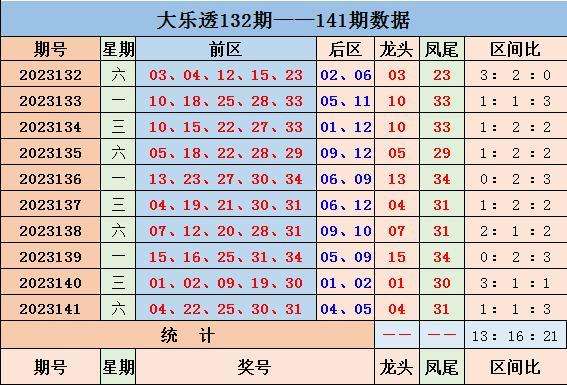 上期回顾,大乐透第2023141开奖,本期奖号:前区04 22 25 30 31;后区04 05,当期前区号码大小比为4:1,三区比1:1:3,奇偶比2:3。前区开出连号30 31,开出重号30。