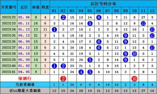 上期后区开出小小偶奇组合:04 05,在近10期开奖中,后区奖号大小比为9:11,奇偶比为10:10,本期后区大范围参考:02 05 06 07 10,特别推荐小大偶偶组合02 10。