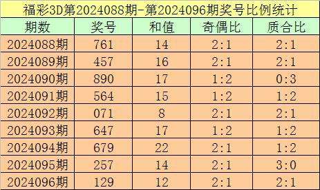 开奖回顾:福彩3D第2024096期:奖号为129,奖号质合比为2:1,大小比为1:2,跨度为8,类型为组六。