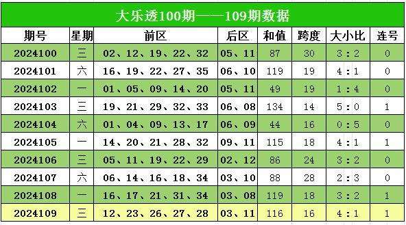 大乐透第2024109期出奖号统计:前区12、23、26、27、28,后区03、11。和值116,跨度16,大小比4:1,开出1组连号。