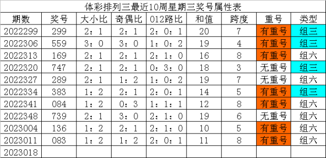 体彩排列三最近10周星期三奖号分别为:299、559、169、747、289、383、084、739、136、083,各奖号属性详见下表: