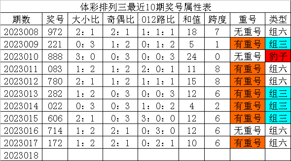 体彩排列三最近10期分别开出奖号:972、221、888、083、780、282、022、606、714、172,各奖号属性详见下表: