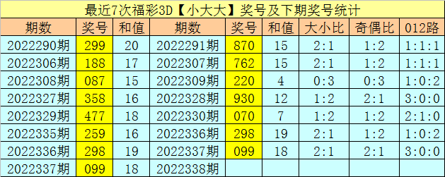 一、福彩3D上期奖号为099,大小类型开出:小大大,历史上该大小类型奖号共出现922次,最近7次【小大大】奖号分别开出:299、188、087、358、477、259、298,其中组三号码出现3次,组六号码出现4次。