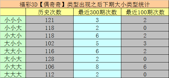 二、最近7次【小大大】奖号之后,其下期分别开出号码:870、762、220、930、070、298、099,其中组三号码出现3次,组六号码出现4次。本期预计开出组六号码。