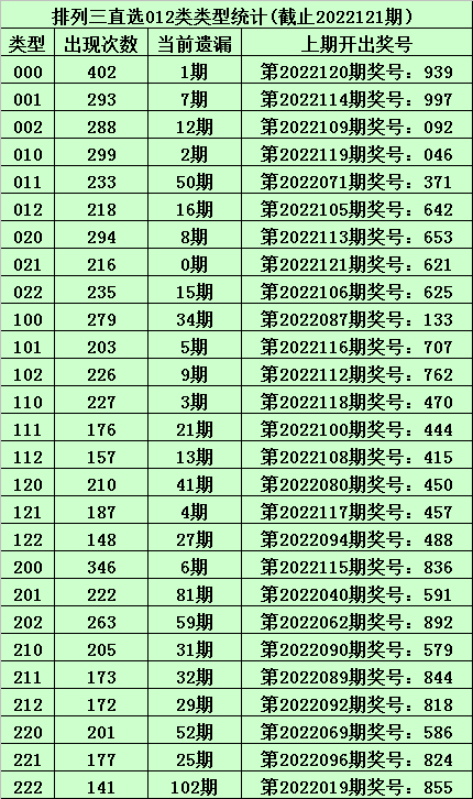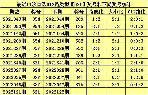 排列三上期开出奖号为:621,其直选012路类型为021,历史上直选021号码已开出了216次,最近11期分别开出奖号为:054、954、951、654、357、321、321、924、087、387、621。