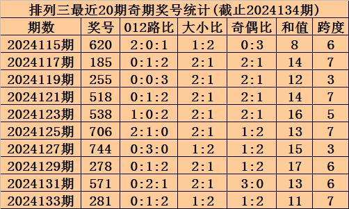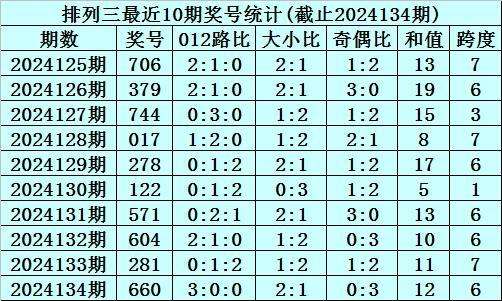 上期回顾:排列三2024134期奖号为660,奇偶比为0:3,大小比为2:1,跨度为12。