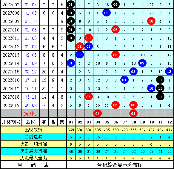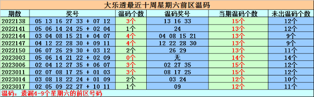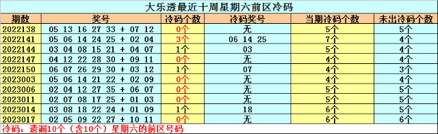 冷号分析:前区冷号在最近十周星期六开出6个,平均每期有。6个,冷号有解冻的趋势,近期继续放弃冷号,上周星期六冷号没有出现,目前星期六有9个冷号,本周星期六重点关注冷号,参考冷号01 32。