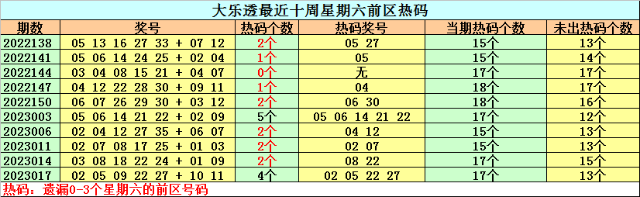 热号分析:最近十周星期六前区热号出现21个,每期平均开出2。1个,热号与理论个数基本相当,上周星期六热号开出4个,热号出现频次较高,目前星期六热码有15个,本周星期六防热号开出走冷,在2个以内开出,热号参考17 22。