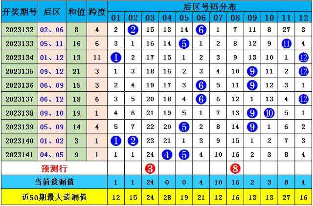 后区分析:大乐透后区上期开出偶奇组合,跨度为1。近10期后区奇偶组合出现4期,偶奇组合出现2期,奇奇组合出现2期,偶偶组合出现2期,本期预计奇偶组合回补;近10期后区两码跨度1-5开出7次,6-11开出3次,预计本期后区两码跨度为5,两码综合推荐:03、08。