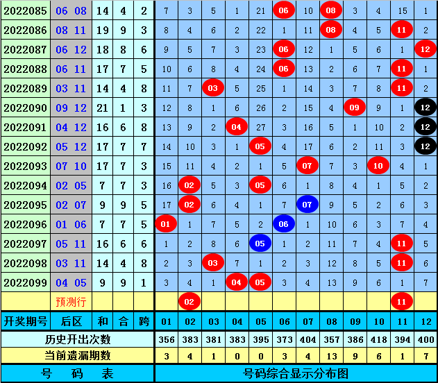 后区分析(定义:01-04为一区,05-08为二区,09-12为三区):上期后区开出奖号04和05一区和第二区和区,,最近10期后区三个区间落号个数比为6:7:7,本期后区注意第二区和第三区号码出现,关注两码02、11。