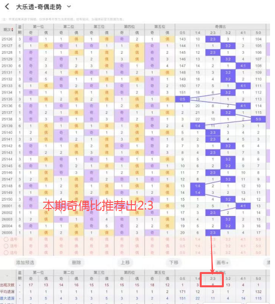 4、奇偶比:上期开出2个奇数,出3个偶数,奇偶比为2:3,整体看偶数强势,本期关注偶数,本期推荐出2:3。