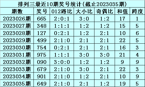 上期回顾:排列三2023035期奖号为649,奇偶比为1:2,大小比为2:1,跨度为19。