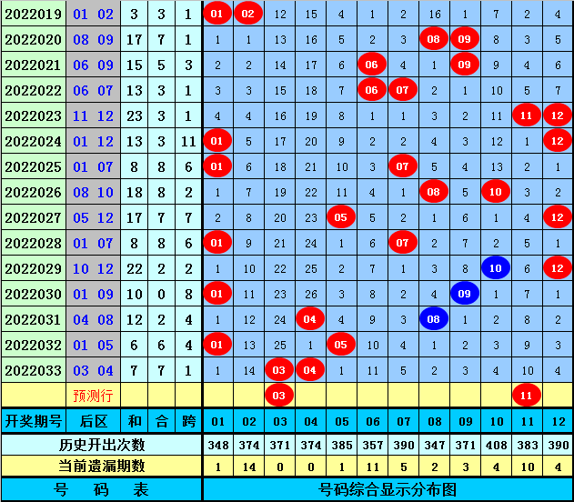 后区分析:上期后区奖号为03和04,最近5期后区和值分别为22、10、12、6、7,后区跨度分布范围在1-8,本期后区注意两码03、11。