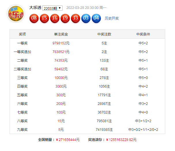 大乐透第2022033期奖号为:08、15、16、19、33+03 04,其中前区奇偶比为3:2,大小比为2:3,和值为91,后区和值为7,跨度为1。