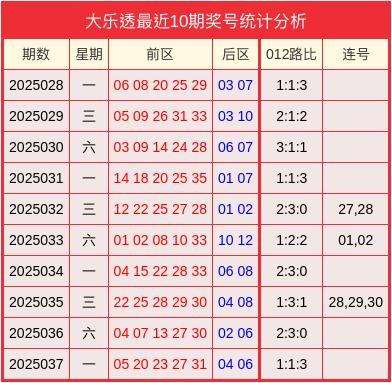 开奖回顾:大乐透2025037开奖号码为05、20、23、27、31+04、06。其中012路比为1:1:3、无连号。