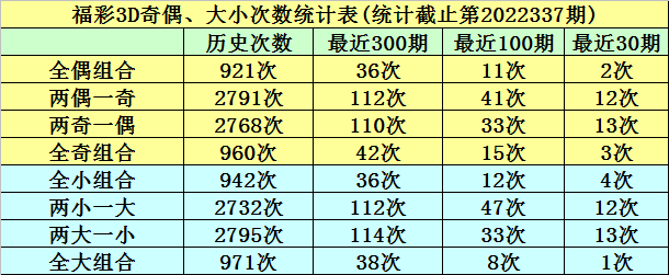 在前10期开奖中,全小组合出现0次,两小一大组合出现3次,两大一小组合出现7次,全大组合出现0次,本期预计开出两大一小组合。