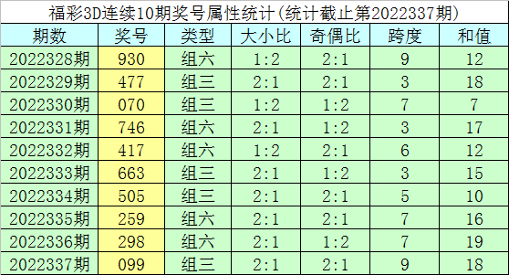 开奖回顾:福彩3D第2022337期奖号为099。奖号形态为组三,大小形态为小大大,奇偶形态为偶奇奇,和值为18,跨度为9。