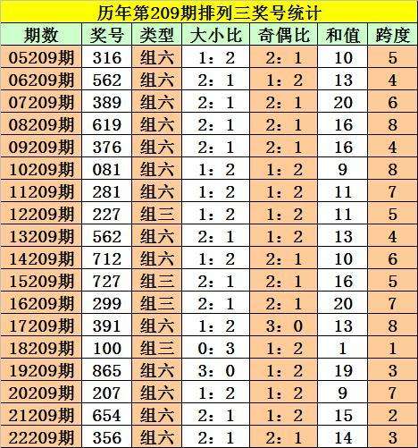 历年第209期奖号:大小比为28:26,大小号持平,本期注意大号,大小比参考2:1。