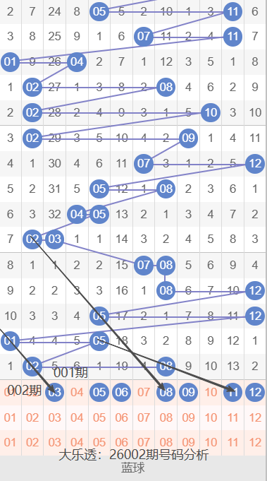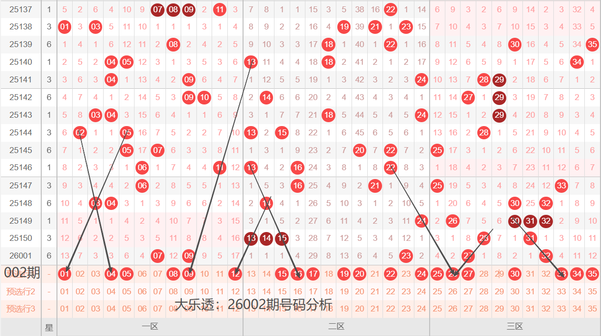 通过上期号码的简单分析,我们看下26002期红色号码球的总体走势,如下图: