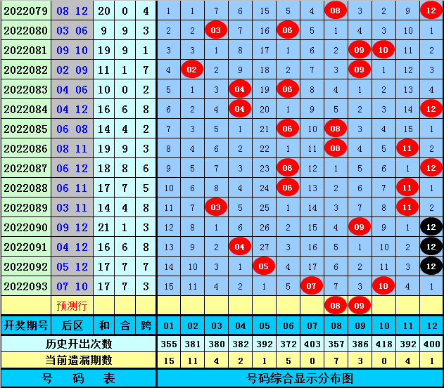 后区第二位推荐:在连续5期开奖中分别出号:11、12、12、12、10,均值为11。4,其中奇数奖号表现较冷,本期适当关注回补,参考奇数号码09。