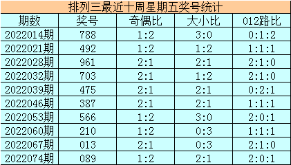 排列三十周星期五分别开出奖号:089、013、210、566、387、475、703、961、492、788,其中号码奇偶比为15:15,奇偶号码出现比例相当;号码大小比为16:14,大小号码开出个数相当;号码012路比为13:9:8,0路号码热出。