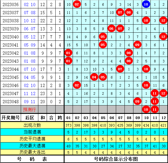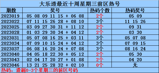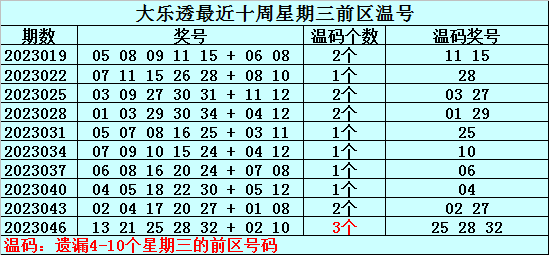 冷号:最近十周星期三前区开出12个冷号,上周星期三冷号出现2个,本周星期三放弃冷号出现的可能。