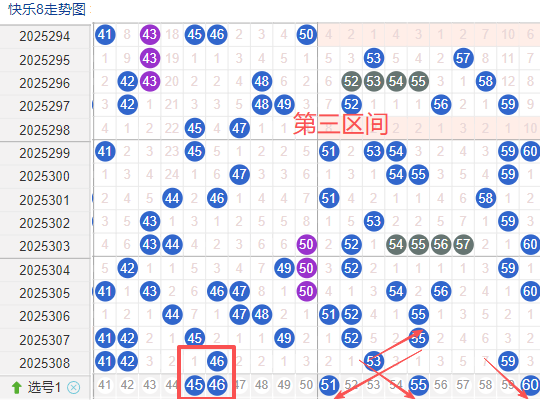 三区间开出了5个奖号(41.42.46.53.59)上期回顾三区开出5个奖号上期的三区间的奖号数量呈现一个递减的形态,4头回补3个,本期先来看号码45近期出现频率相对来说还是很稳定。偶尔有时间隔期数也是很长,说明其在近期的开奖中较温热的,号码46在近 30 期内出现次数相对还是稳定的号码,近期的活跃度也是较温热。号码51有一定的间歇性,通常间隔5-3期会出现一次,没有明显的连续出现态势,走势相对较稳定,在整个第三区间的表现本期还是可以防守的。号码55走势相对近期较热,近期没有连续间隔落号的情况,活跃度近期处于较稳定状态注意防守。